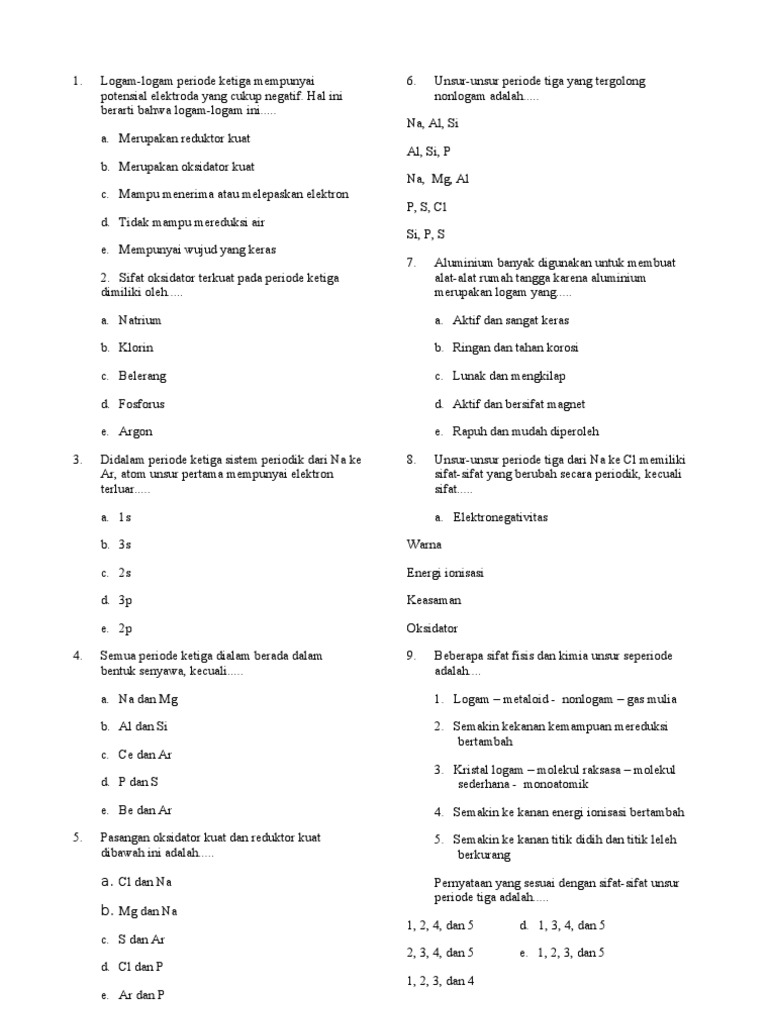 Pernyataan yang benar tentang sifat sifat keperiodikan unsur dalam satu periode dari kiri ke kanan adalah A. Soal berikut yang telah kami rangkum ini pada umumnya sering keluar pada ujian nasional jadi sangat bermanfaat untuk siswa pelajari dan pahami. Soal un kimia tentang alkali tanah.