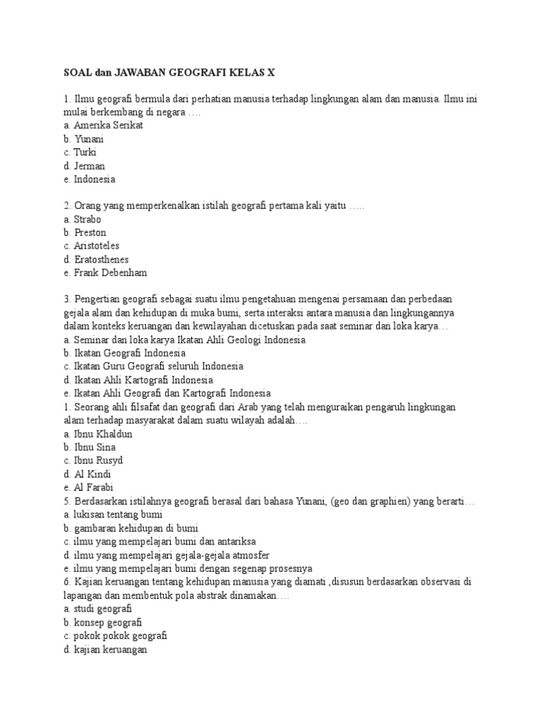 Berikut contoh soal geografi kelas x semester 1 kurikulum 2013 beserta jawabannya untuk siswa SMAMASederajat.