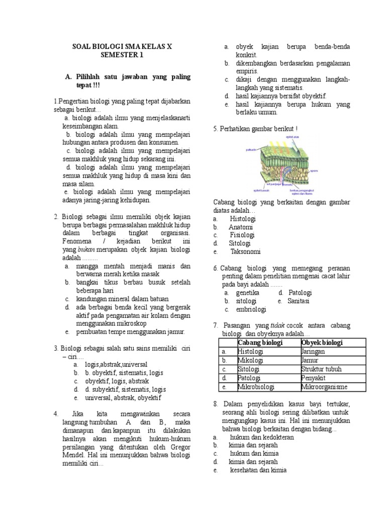 Latihan soal semester 1 biologi kelas x beserta jawaban. Dalam Bab I mata pelajaran Biologi kelas X semester I dikupas tuntas mengenai ruang lingkup Biologi.