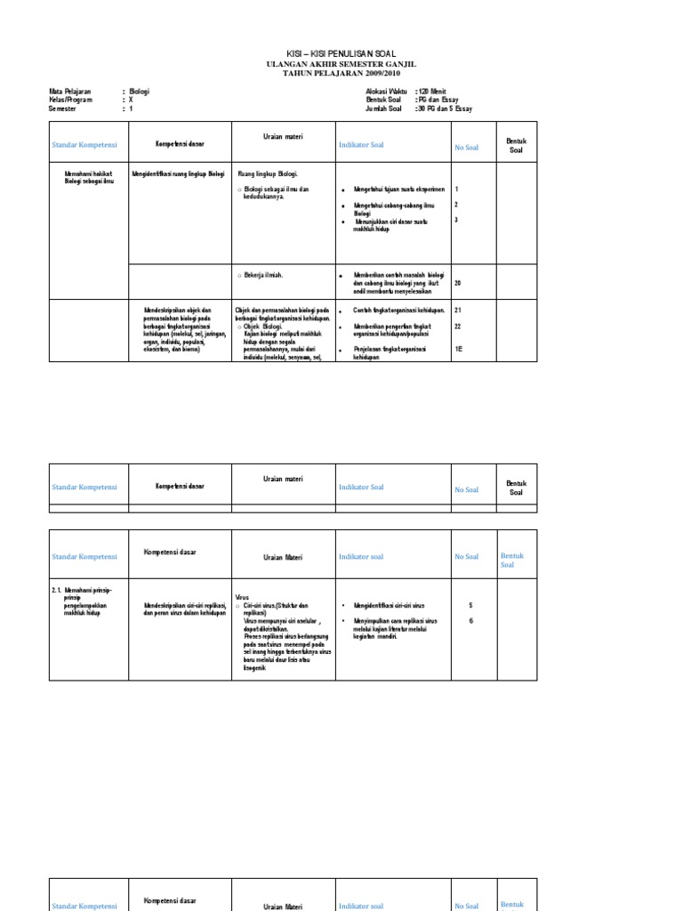 Kisi Kisi Uas Biologi Kelas X Semester 1