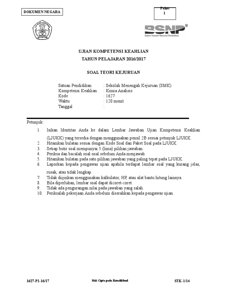 Soal ini ditujukan khusus bagi siswai SMKMAK Program Keahlian Kimia Analisis untuk bahan persiapan latihan UNUNBK Ujian Teori Kejuruan Tahun Pelajaran 20172018. Kisi-kisi UN Teori Jurusan SMK KST-Kimia Analisis K13 2020pdf Unduh. Soal Teori Kejuruan Kimia Analisis.