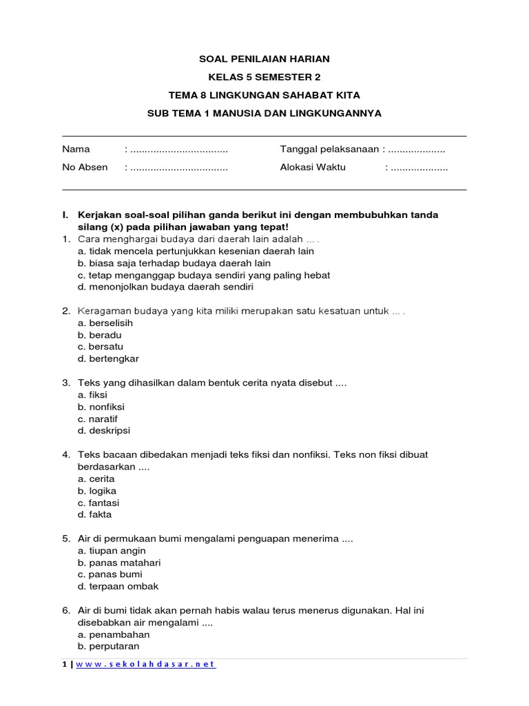 Kumpulan Soal Penilaian Harian Kelas 5 Tema 8 Sekolahdasar Net