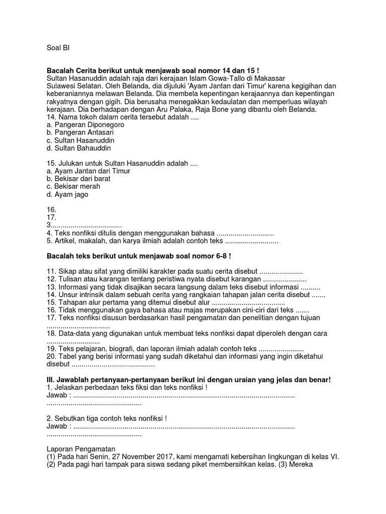 Demikian 10 contoh soal materi buku fiksi dan nonfiksi yang bisa digunakan sebagai soal ulangan kenaikan kelas UKK di semester genap untuk kelas 7 mata pelajaran Bahasa Indonesia. Bahan Bacaan Literasi Teks Fiksi Level 3 Kelas 5 dan Kelas 6 Bacaan berikut untuk menjawab soal nomor 1 11 17 18 dan 21. Soal Bahasa Indonesia Kelas 6 Dan Kunci Jawabannya Semester 2.